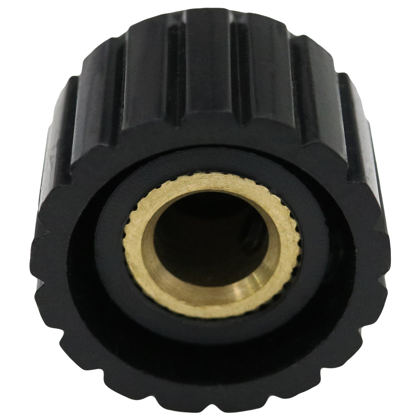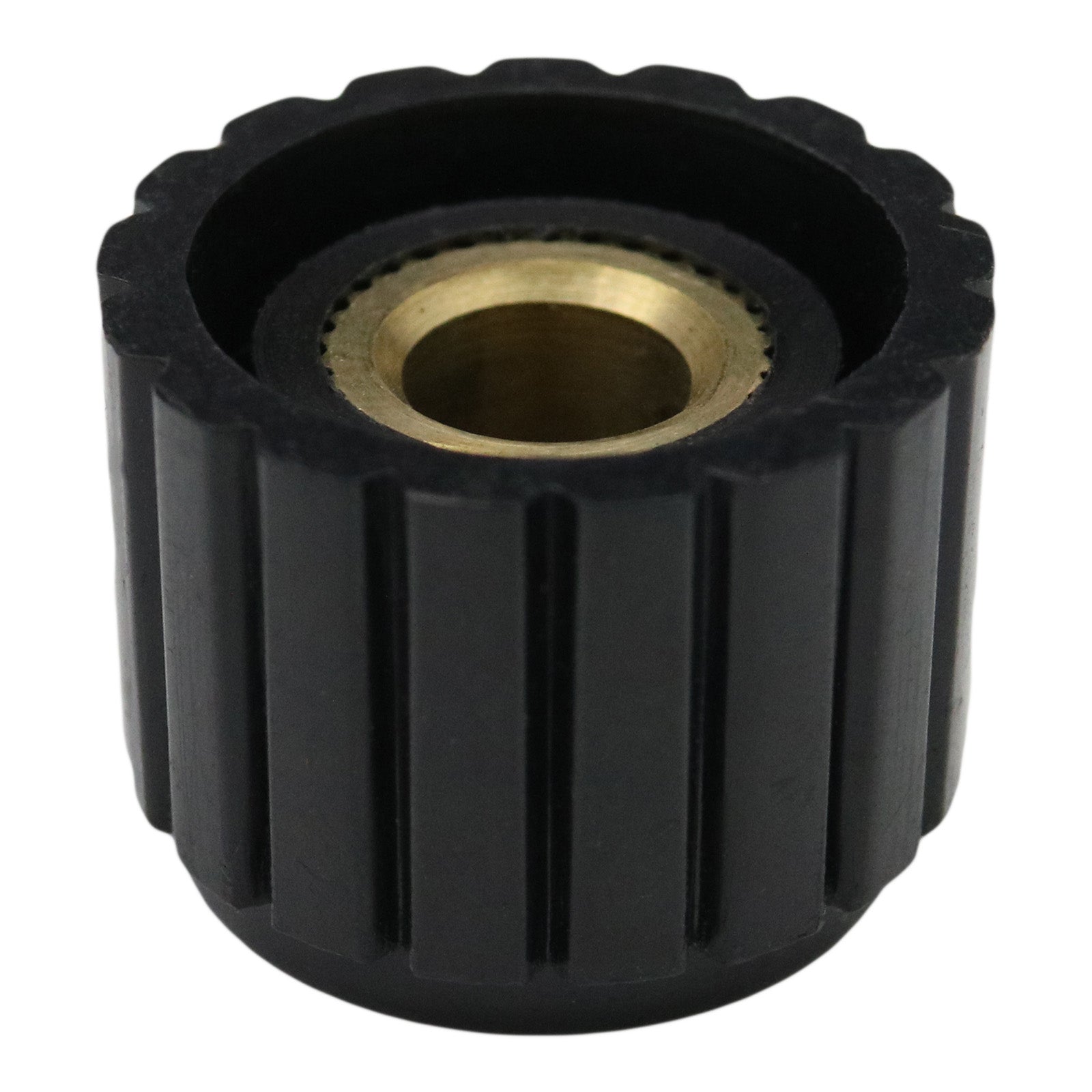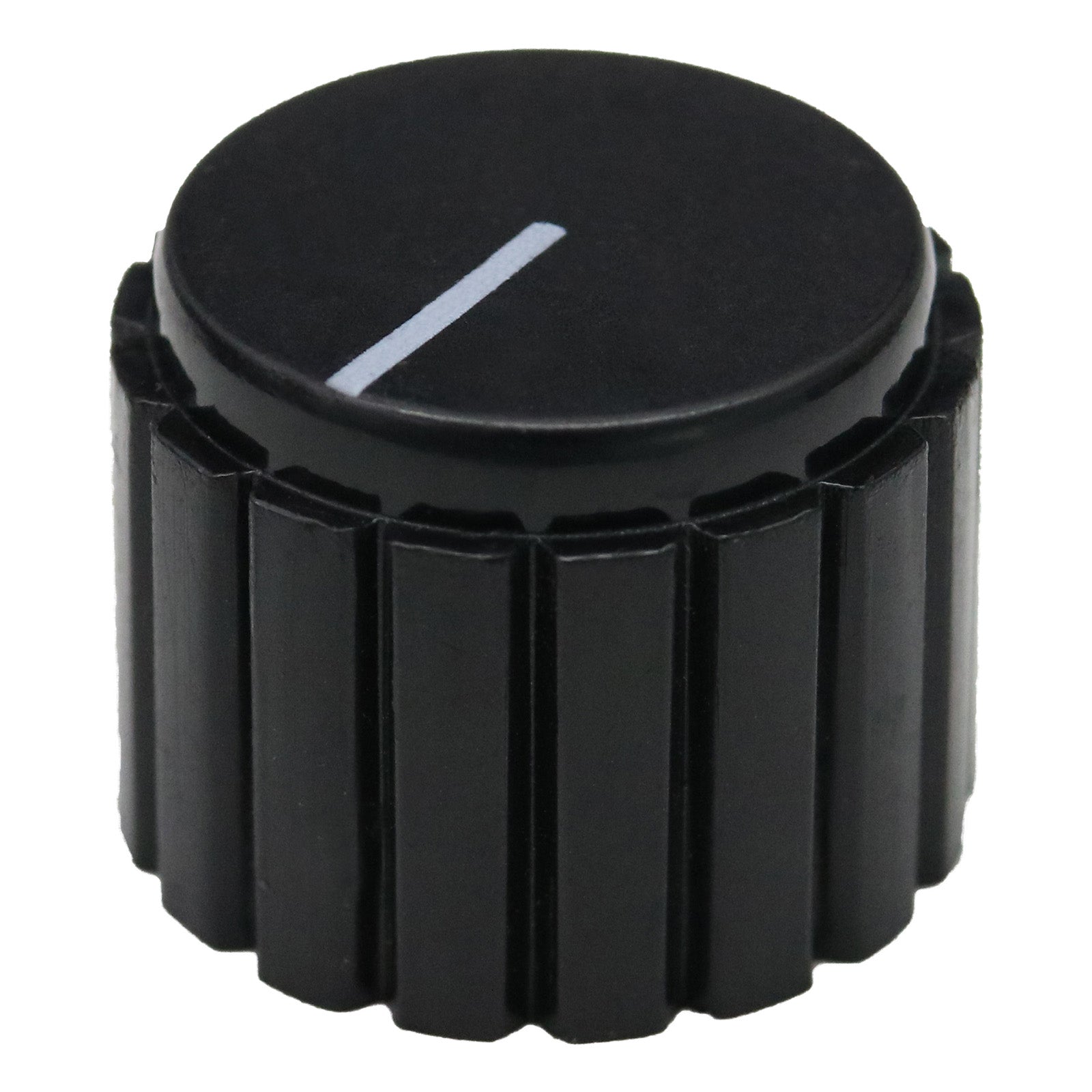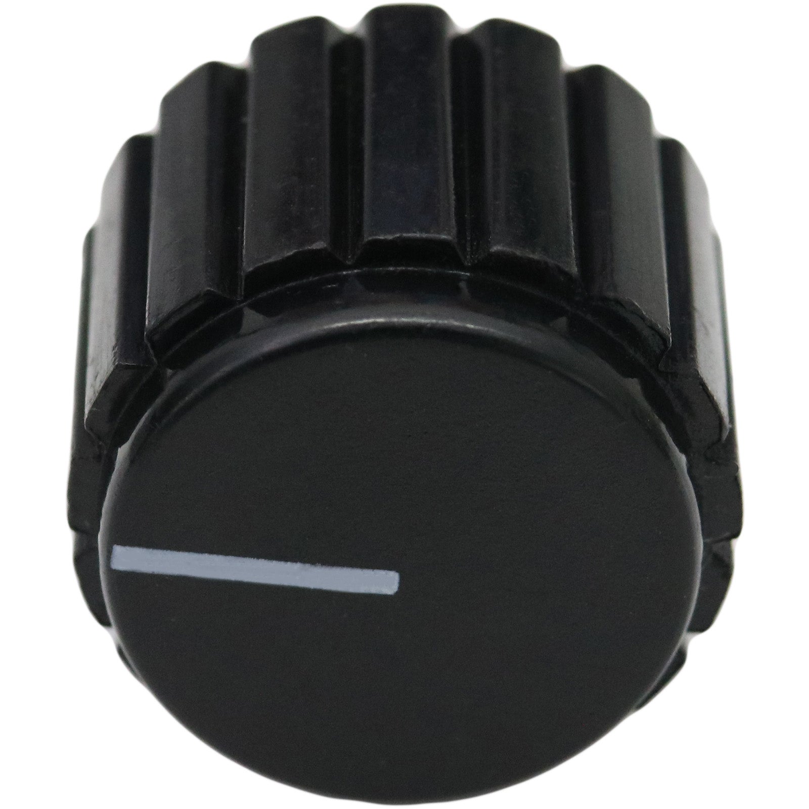 This cylindrical control knob features a black body with prominent ridges around its circumference that provide excellent grip and tactile feedback. The knob is topped with a distinctive white position indicator line that clearly shows the current setting against the black surface.