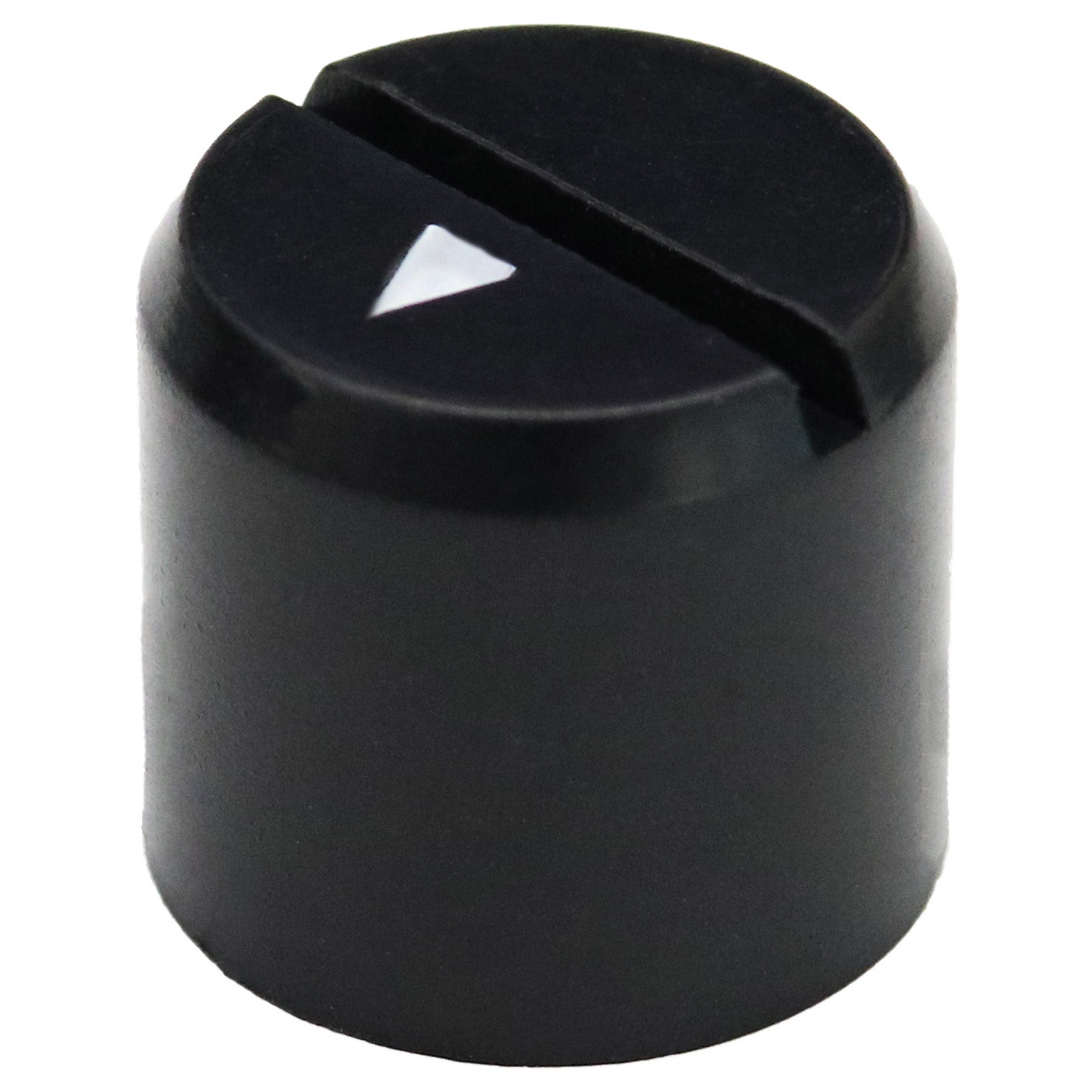 This compact control knob features a distinctive slot-top design that accommodates both manual adjustment and tool-based operation. The knob's cylindrical body presents a clean, minimalist appearance with a smooth circumference that provides comfortable grip during operation. A prominent white triangular position indicator is positioned on the top surface, offering clear visual reference for precise positioning.