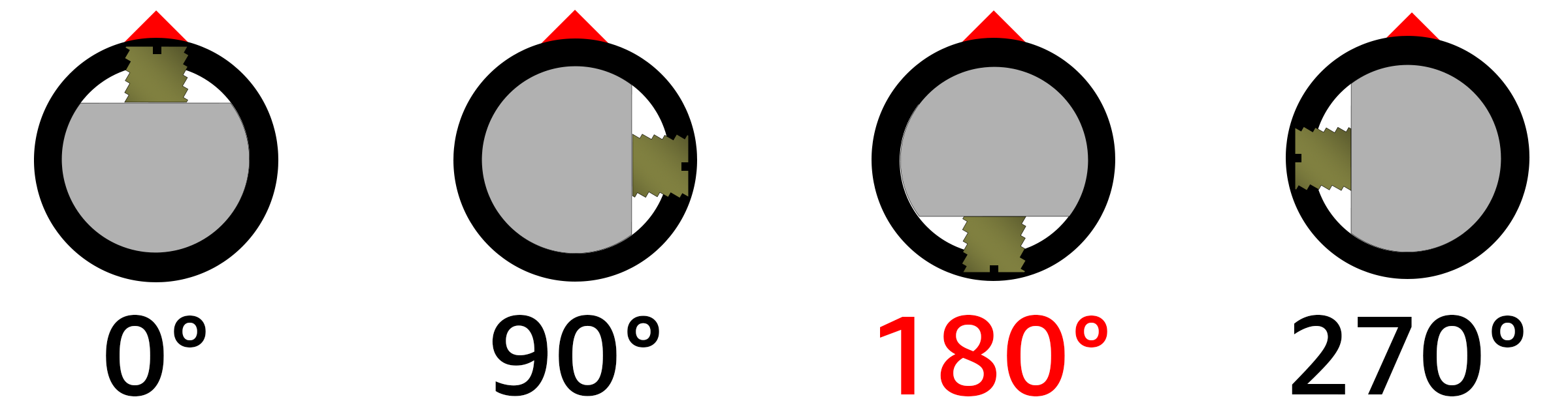 A View from the underside of the knob when fitting a round hole knob to a D shaft, showing the grub screw position relative to the position indicator: