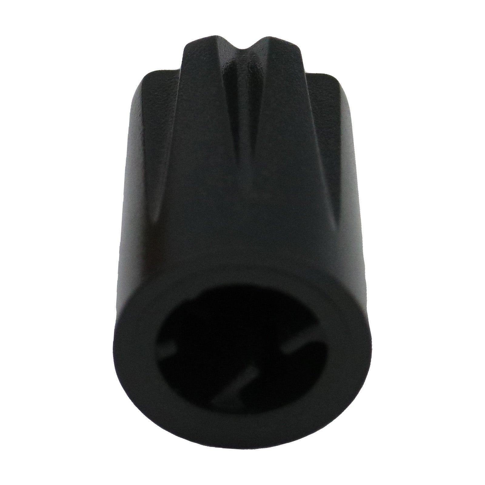 A D-shaft knob features a hole with a D-shaped cross-section, having one flat side and the rest round. This configuration ensures that the knob fits snugly onto the shaft, preventing any slippage and provides absolute psoitoning of the position indicator.